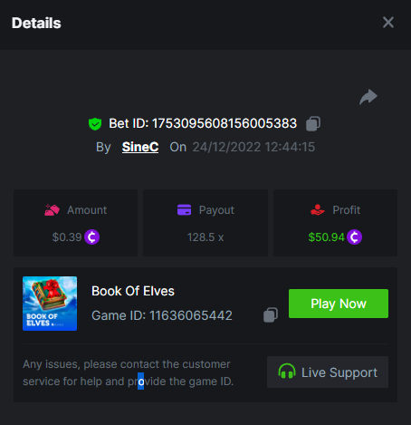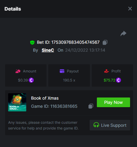 $4000 Christmas week special multiplier battle by SpinomenalSineC replied to BCGame_Ewa's topic in Christmas Special Santa’s Wild Night 257.6 https://bc.game/#/sd/10ZX2V5PJA0PHV Book Of Elves 128.5 https://bc.game/#/sd/10ZX473Y0NJF9V Wild Santa 2 45 https://bc.game/#/sd/10ZX8YOF4B12J7 Book of Xmas 190.5 https://bc.game/#/sd/10ZX686WZ5A977