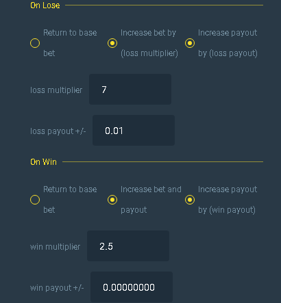 CRAZYYYYBET Posted August 15, 2020 Author Share Posted August 15, 2020 var config = { baseBet: { label: 'base bet', value: currency.minAmount * 1.2, type: 'number' }, basePayout: { label: 'base payout', value: 2, type: 'number' }, stop: { label: 'stop if bet >', value: 1e8, type: 'number' }, onLoseTitle: { label: 'On Lose', type: 'title' }, onLoss: { label: '', value: 'increase', type: 'radio', options: [ { value: 'reset', label: 'Return to base bet' }, { value: 'increase', label: 'Increase bet by (loss multiplier)' }, { value: 'increase', label: 'Increase payout by (loss payout)' } ] }, lossMultiplier: { label: 'loss multiplier', value: 2, type: 'number' }, lossAdd: { label: 'loss payout +/-', value: 1, type: 'number' }, onWinTitle: { label: 'On Win', type: 'title' }, onWin: { label: '', value: 'reset', type: 'radio', options: [ { value: 'reset', label: 'Return to base bet' }, { value: 'increase', label: 'Increase bet and payout' }, { value: 'increase', label: 'Increase payout by (win payout)' } ] }, winMultiplier: { label: 'win multiplier', value: 2, type: 'number' }, winAdd: { label: 'win payout +/-', value: 1, type: 'number' }, } function main () { var currentBet = config.baseBet.value; var currentPayout = config.basePayout.value; engine.on('GAME_STARTING', function () { engine.bet(currentBet, currentPayout); }) engine.on('GAME_ENDED', function () { var history = engine.getHistory() var lastGame = history[0] // If we wagered, it means we played if (!lastGame.wager) { return; } var lose1 = config.lossMultiplier.value; var lose2 = config.winMultiplier.value; var con1 = currentBet/lose2/2/lose1/lose1; var con2 = currentBet/3/lose1/lose1/lose2/2; var con3 = currentBet/3/3/lose1/lose1/lose2/2; var con4 = currentBet/3/3/3/lose1/lose1/lose2/2; var con5 = currentBet/3/3/3/3/lose1/lose1/lose2/2; var con6 = currentBet/3/3/3/3/3/lose1/lose1/lose2/2; var con7 = currentBet/3/3/3/3/3/3/lose1/lose1/lose2/2; var cons1 = currentBet/lose2; // we won.. if (lastGame.cashedAt) { if (config.onWin.value === 'reset') { currentBet = config.baseBet.value; currentPayout = config.basePayout.value; } else { if(cons1 == config.baseBet.value){ currentBet = config.baseBet.value; currentBet *= config.winMultiplier.value * 2; log.success('WON'); }else{ currentBet = config.baseBet.value; currentPayout = config.basePayout.value; currentBet *= config.winMultiplier.value; currentPayout += config.winAdd.value; } } log.success('We won, so next bet will be ' + currentBet + ' ' + currency.currencyName + ' at payout ' + currentPayout + ' x'); }else{ if (config.onLoss.value === 'reset') { currentBet = config.baseBet.value; currentPayout = config.basePayout.value; } else { if(con1 == config.baseBet.value){ currentBet *= 3; log.error('lose 3'); }else if(con2 == config.baseBet.value){ currentBet *= 3; log.error('lose 4'); }else if (con3 == config.baseBet.value){ currentBet *= 3; log.error('lose 5'); }else if (con4 == config.baseBet.value){ currentBet *= 3; log.error('lose 6'); }else if (con5 == config.baseBet.value){ currentBet *= 3; log.error('lose 7'); }else if (con6 == config.baseBet.value){ currentBet *= 3; log.error('lose 8'); }else if (con7 == config.baseBet.value){ currentBet *= 3; log.error('lose 8'); }else{ currentBet *= config.lossMultiplier.value; currentPayout += config.lossAdd.value; } } log.error('We lost, so next bet will be ' + currentBet + ' ' + currency.currencyName + ' at payout ' + currentPayout + ' x'); } if (currentBet > config.stop.value) { log.error('Was about to bet' + currentBet + 'which triggers the stop'); engine.stop(); } }) } Link to comment Share on other sites More sharing options...