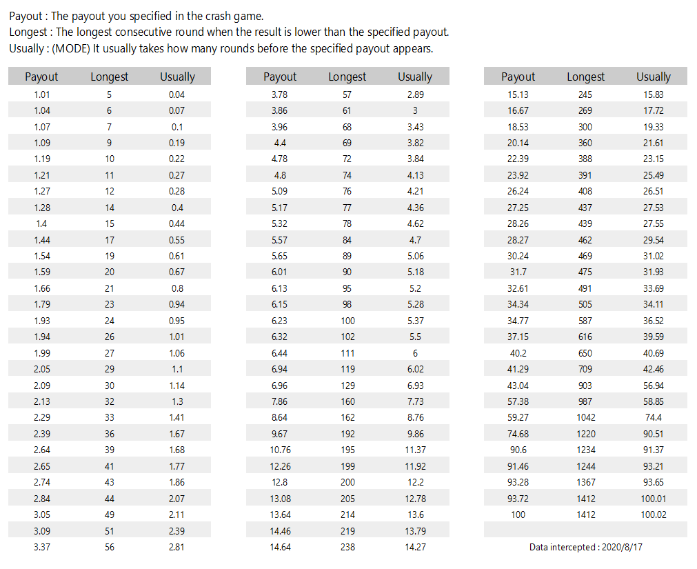 The latest statistics of the longest consecutive round when the result is lower than the specified payout.